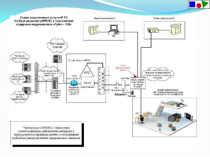 Принципиальная схема IPTV Для организации предоставления интерактивного телевидения через cети широкополосного доступа операторов связи по технологии IPTV необходима интеграция в сеть оператора связи комплекса, обеспечивающего прием и шифрацию цифрового сигнала, on-line/off-line-перекодирование сигнала в вещательный формат, преобразование multicast/unicast-потоков и вещание их в сеть.
