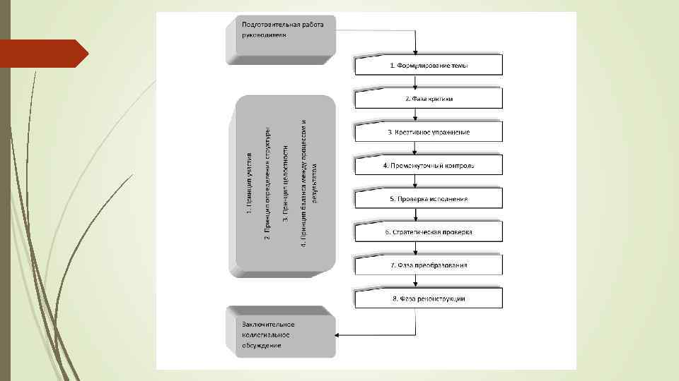 Принципы и правила Ценностно-смысловое равенство всех участников, включая мастера-руководителя. Право каждого участника на ошибку. Безоценочность, отсутствие критических замечаний в адрес любого участника мастерской. Предоставление свободы в рамках принятых правил, что дает ощущение внутренней свободы: • право выбора на разных этапах мастерской (обеспечивается руководителем); • право самостоятельности действий (без дополнительных разъяснений руководителя); • право не участвовать на этапе предъявления результата. Большой элемент неопределенности (даже загадочности), что стимулирует творческий процесс. Диалог как главный принцип взаимодействия, сотрудничества, сотворчества. • диалоги участников мастерской • диалоги отдельных групп • диалог с самим собой • диалог с научным или художественным авторитетом. Организация и перестройка реального пространства, в котором происходит мастерская, в зависимости от задачи каждого этапа. Решительное ограничение участия, практической деятельности мастера-руководителя как авторитета на всех этапах мастерской.
