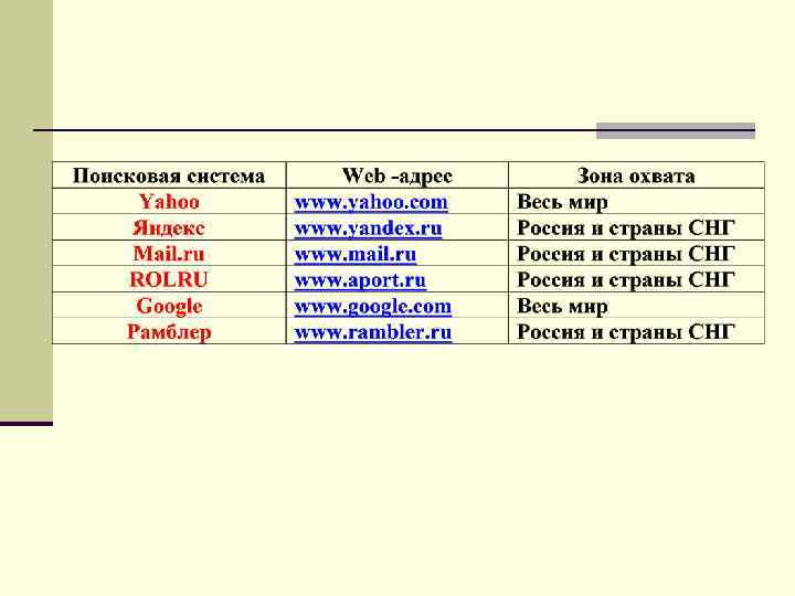 В настоящее время самыми популярными для российских пользователей Интернета являются три крупные поисковые системы индексного типа: Эти системы учитывают грамматические особенности русского языка, поэтому результаты их поиска в русскоязычных ресурсах отличаются более высоким качеством, чем у западных систем.