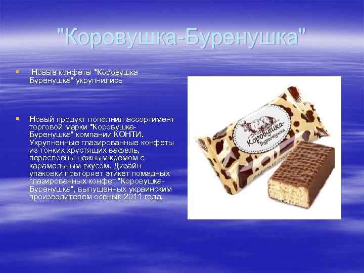"Коровушка-Буренушка" § Новые конфеты "Коровушка- Буренушка" укрупнились § Новый продукт пополнил ассортимент торговой марки "Коровушка- Буренушка" компании КОНТИ. Укрупненные глазированные конфеты из тонких хрустящих вафель, переслоены нежным кремом с карамельным вкусом. Дизайн упаковки повторяет этикет помадных глазированных конфет "Коровушка- Буренушка", выпущенных украинским производителем осенью 2011 года.