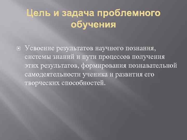 Цель и задача проблемного обучения Усвоение результатов научного познания, системы знаний и пути процессов получения этих результатов, формирования познавательной самодеятельности ученика и развития его творческих способностей.