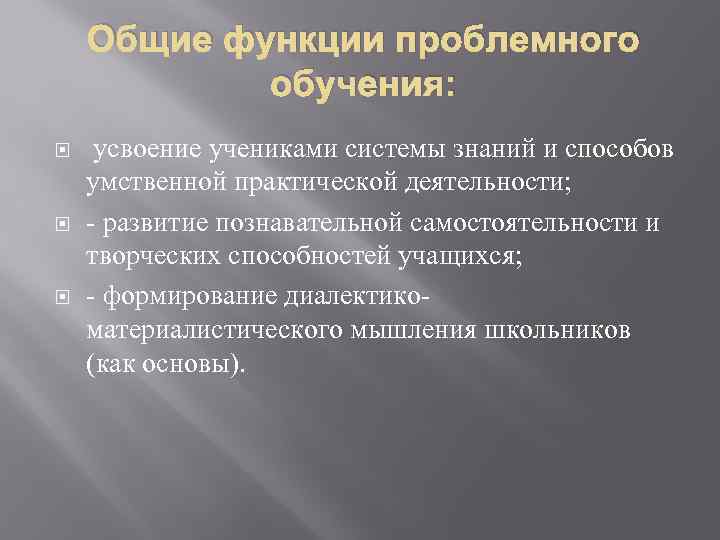 Общие функции проблемного обучения: усвоение учениками системы знаний и способов умственной практической деятельности; - развитие познавательной самостоятельности и творческих способностей учащихся; - формирование диалектикоматериалистического мышления школьников (как основы).