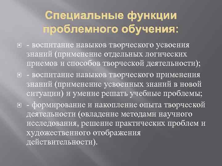 Специальные функции проблемного обучения: - воспитание навыков творческого усвоения знаний (применение отдельных логических приемов и способов творческой деятельности); - воспитание навыков творческого применения знаний (применение усвоенных знаний в новой ситуации) и умение решать учебные проблемы; - формирование и накопление опыта творческой деятельности (овладение методами научного исследования, решение практических проблем и художественного отображения действительности).