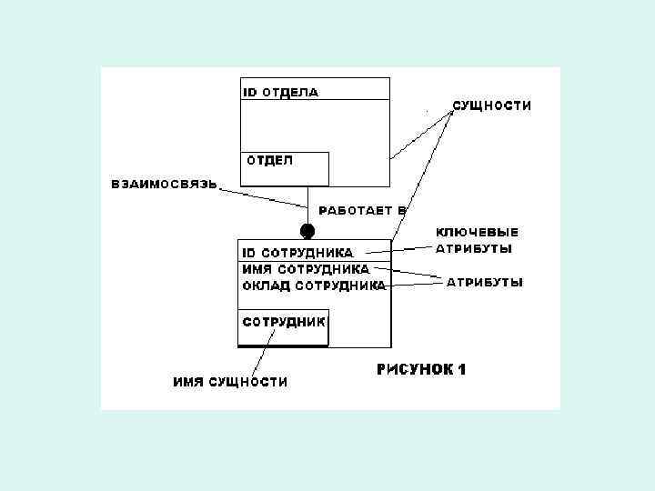 Концепция и семантика IDEF 1 X • • • IDEF 1 X является методом для разработки реляционных баз данных и использует условный синтаксис, специально разработанный для удобного построения концептуальной схемы. Сущность описывает собой совокупность или набор экземпляров похожих по свойствам, но однозначно отличаемых друг от друга по одному или нескольким признакам. Каждый экземпляр является реализацией сущности. Таким образом, сущность в IDEF 1 X описывает конкретный набор экземпляров реального мира, в отличие от сущности в IDEF 1, которая представляет собой абстрактный набор информационных отображений реального мира. Каждый атрибут содержит только часть информации о сущности. Связи представляют собой ссылки, соединения и ассоциации между сущностями. Связи это суть глаголы, которые показывают, как соотносятся сущности между собой. Отдел <состоит из> нескольких Сотрудников Самолет <перевозит> нескольких Пассажиров. Сотрудник <пишет> разные Отчеты.