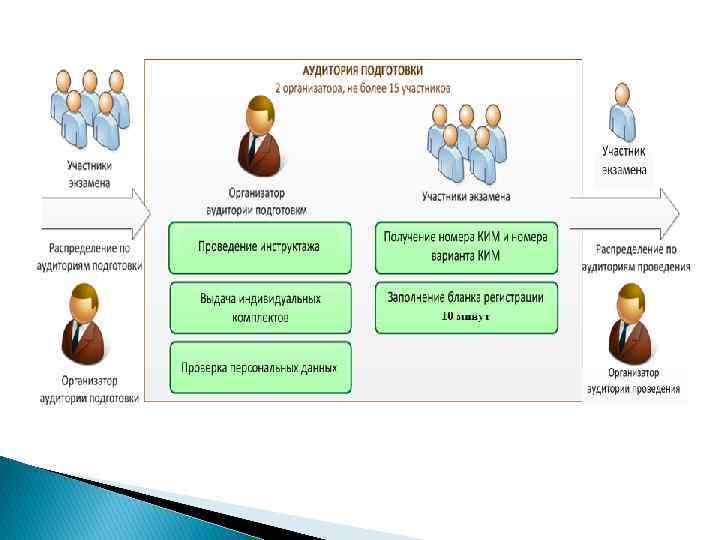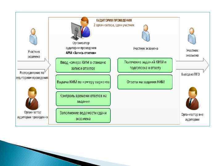 В ППЭ должны быть подготовлены: 1) Для проведения письменной части стандартные аудитории (на 15 человек – 1 аудитория). 2) Для проведения устной части: - аудитория ожидания (выполняются следующие действия): q контроль явки участников; q проведение общего инструктажа; q ожидание сдачи экзамена. ‒ аудитория технической подготовки (на 15 человек) (выполняются следующие действия): q проведение инструктажа; q выдача индивидуальных комплектов, номеров контрольных измерительных материалов (далее КИМ) и номеров варианта; q проверка персональных данных; q заполнение бланка регистрации. ‒ аудитория сдачи экзамена (аудитория, в которой выполняются следующие действия): q выдача КИМ по номеру варианта; q аудиозапись ответов на задания КИМ; q заполнение ведомостей сдачи экзамена.