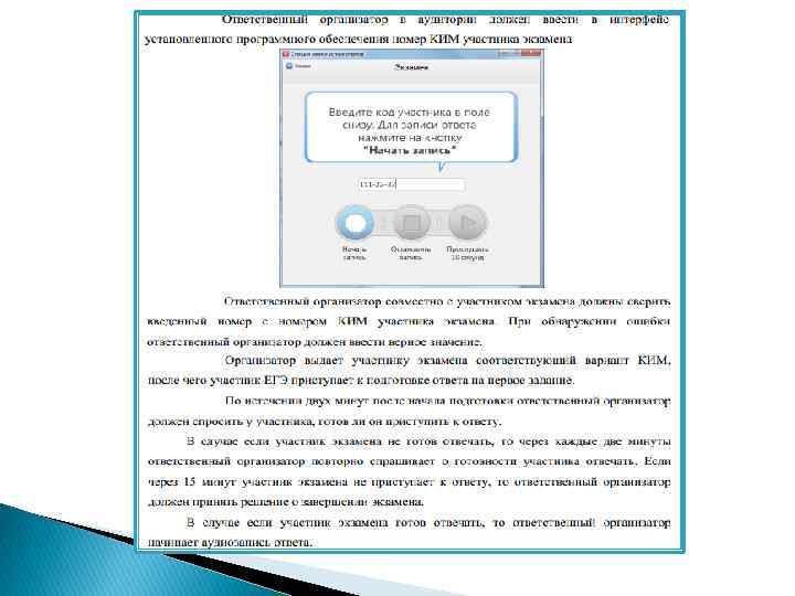 3. Для проведения экзамена используются три типа аудиторий: аудитория ожидания, аудитория подготовки и аудитория проведения. 4. Экзамен проводится в один день: вначале сдаётся письменная часть, затем– устная. 5. Запись устных ответов участника ЕГЭ на электронный носитель осуществляет находящийся в ППЭ технический специалист.