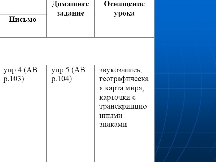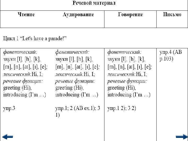 Содержание: n n n цели уроков, сопутствующие задачи, предметное содержание речи и социокультурное содержание отобранного материала, упражнения для овладения речевым материалом в каждом из четырех видов речевой деятельности, домашнее задание, оснащение урока.