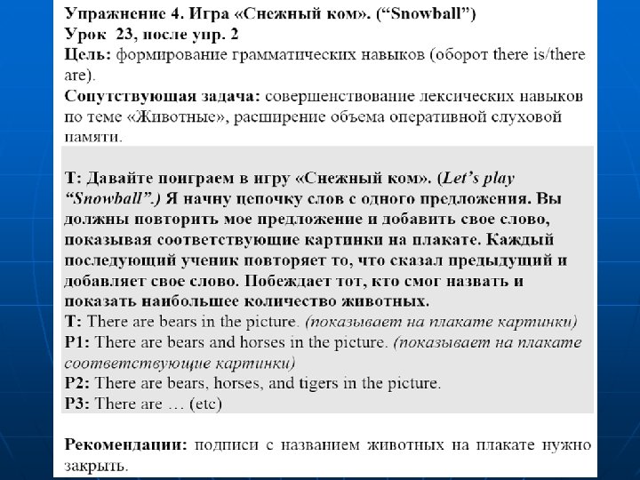 Упражнение 6. Урок 41, после упр. 1. 3) Цель: формирование грамматических навыков (оборот there is/there are). Сопутствующая задача: совершенствование лексических навыков по теме «Животные» , расширение объема зрительной оперативной памяти. T: Посмотрите внимательно на плакат и в течение 1 минуты запомните всех животных, изображенных на плакате. Затем я закрою плакат, а вы должны в парах по очереди задавать другу вопросы о том, какие животные и в каком количестве представлены на плакате. P 1: Is there a bear in the picture? P 2: Yes, there is. There is a bear in the picture. P 3: Are there any horses in the picture? P 4: Yes, there are. There are two horses in the picture. Рекомендации: парная работа. Учащиеся задают другу общие вопросы с оборотом there is/there are с опорой на образец на доске и отвечают на них: - Is there a …? - Yes, there is. / No, there isn’t. There is a … - Are there any …? - Yes, there are. / No, there aren’t. There are two …