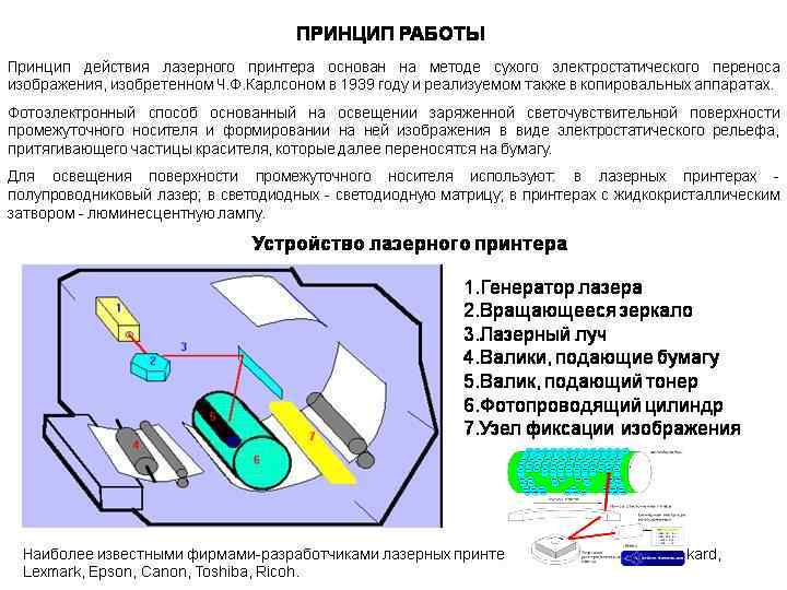 Технология ремонта лазерных принтеров 1 Ролик захвата бумаги не затягивается бумага в принтере 2 Блока тормозной площадки и сепаратора для разделения и захвата только одного листа бумаги. 3 Фотоцилиндр изменяет проводимость под действием света 4 Узел фиксации изображения или «печка» Фиксация изображения происх одит с помощью входящих в состав тонера добавок, имеющих определенную температуру плавления. 5 Термодатчик контроль температуры печки