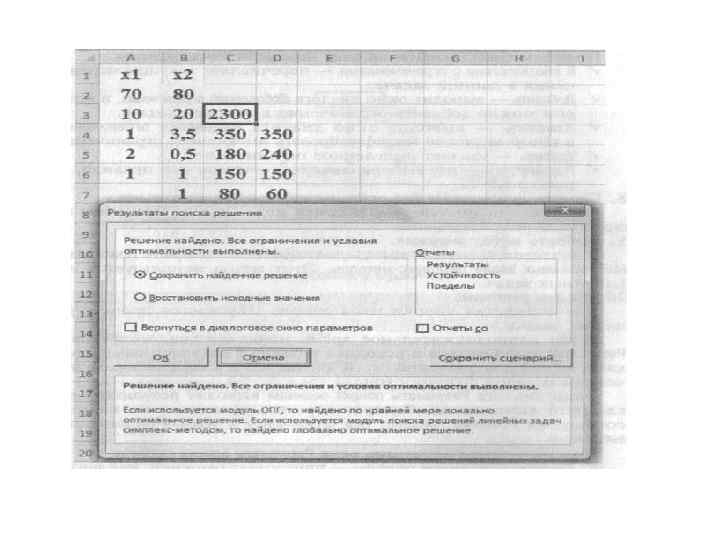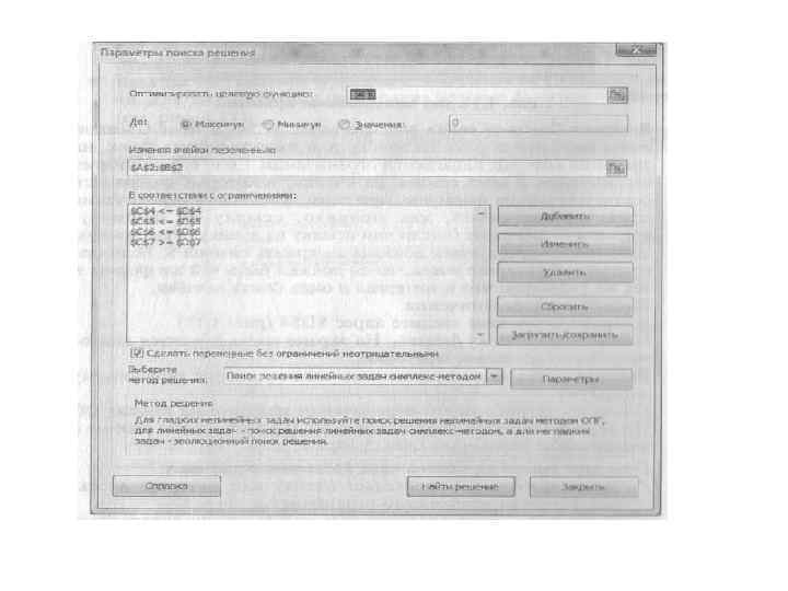 • • • Поясним смысл элементов окна Параметры поиска решения. В соответствии с ограничениями — перечисляет текущие ограни чения в данной задаче. Добавить — выводит окно диалога Добавление ограничения, в кото ром можно добавить ограничения к текущей задаче. Изменить — выводит окно диалога Изменение ограничения, в котором можно модифицировать имеющиеся ограничения. Удалить — удаляет выделенное ограничение. Параметры — при выборе симплекс метода, как правило, не используется. Сделать переменные без ограничений неотрицательными. Обязательно поставьте флажок в поле Сделать переменные без ограничений неотрицательными. Выбрать метод решения. В диалоговом окне Параметры поиска решения выберите Поиск реше ния линейных задач симплекс методом. Этот метод используется для линейных задач. Найти решение. После нажатия кнопки Найти решение запускается процесс ре шения задачи.