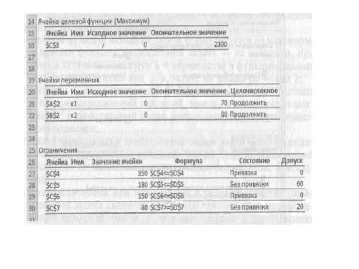 • • • В поле в соответствии с ограничениями вводятся любые необходимые ограничения. Это выполняется следующим образом: В диалоговом окне Параметры поиска решения нажмите кнопку Добавить. В поле Ссылка на ячейки введите ссылку на ячейку или имя диапа зона ячеек, на значения которых налагаются ограничения. Выберите в раскрывающемся списке отношение (<=, =, >=, цел (int), бин (bin) или раз (dif)), которое нужно использовать, между ссылкой и ограничением. Если выбрать: int, в поле Ограничение будет указан статус целое; bin — статус двоичное; dif — статус все разные. Если в поле Ограничение выбрано отношение <=, или >= , вве дите число, ссылку на ячейку (или имя ячейки) или формулу. Выполните одно из указанных ниже действий: чтобы принять данное ограничение и добавить другое, на жмите кнопку Добавить; чтобы принять ограничение и вернуться в диалоговое окно Параметры поиска решения, нажмите кнопку ОК. Примечание. Отношения int, bin и dif можно использовать толь ко в ограничениях для ячеек переменных.
