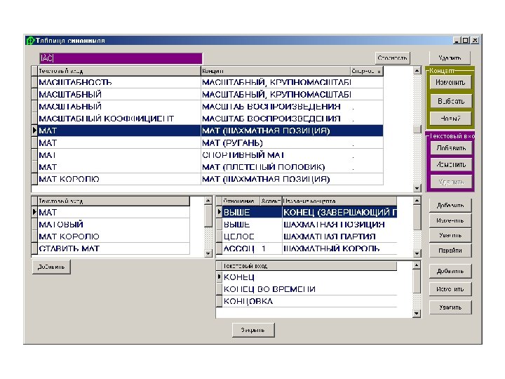 Понятия тезауруса Ру. Тез • Понятие происходит от значения отдельных слов или словосочетаний • Проблемы ввода понятий – Квазисинонимы – Близкие значения многозначных слов • Понятие должно быть отличимо от близких понятий – Однозначно понимаемое имя – Набор текстовых входов – Набор отношений – Название понятия • Единое представление для: – нетематической лексики, – тематической лексики, терминологии