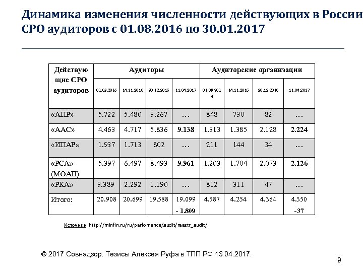 Динамика изменения численности действующих в России СРО аудиторов с 01. 08. 2016 по 30. 01. 2017 ____________________________________ Действую щие СРО аудиторов Аудиторы Аудиторские организации 01. 08. 2016 14. 11. 2016 30. 12. 2016 11. 04. 2017 01. 08. 201 6 14. 11. 2016 30. 12. 2016 11. 04. 2017 «АПР» 5. 722 5. 480 3. 267 … 848 730 82 … «ААС» 4. 463 4. 717 5. 836 9. 138 1. 313 1. 385 2. 128 2. 224 «ИПАР» 1. 937 1. 713 802 … 211 144 34 … «РСА» (МОАП) «РКА» 5. 397 6. 497 8. 493 9. 961 1. 203 1. 704 2. 073 2. 126 3. 389 2. 292 1. 190 … 812 311 47 … Итого: 20. 908 20. 699 19. 588 19. 099 4. 387 4. 254 4. 364 4. 350 - 1. 809 -37 Источник: http: //minfin. ru/ru/perfomance/audit/reestr_audit/ © 2017 Совнадзор. Тезисы Алексея Руфа в ТПП РФ 13. 04. 2017. 9