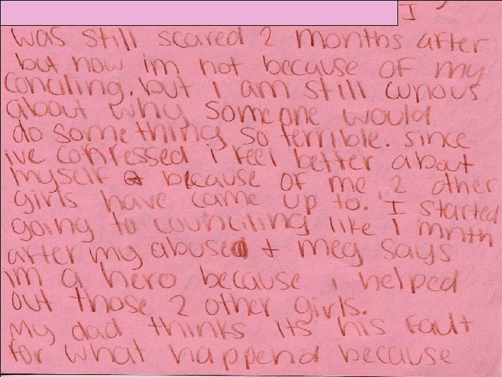 Client • 12 year old Caucasian female • Molested for multiple years with most recent incident including penetration • Mother died 2 years ago after being hit by car • Dad works long hours, family house is central gathering place for Dad’s friends • Live with paternal grandmother and Dad