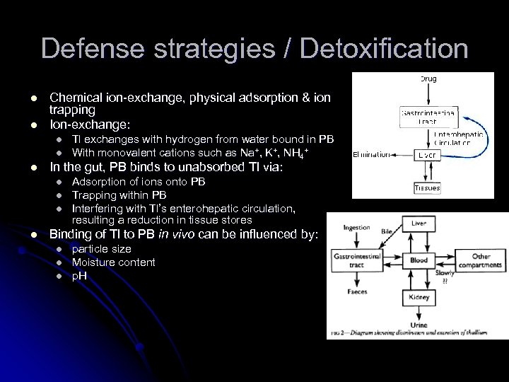 Defense strategies / Detoxification l l Chemical ion-exchange, physical adsorption & ion trapping Ion-exchange: l l l In the gut, PB binds to unabsorbed Tl via: l l Tl exchanges with hydrogen from water bound in PB With monovalent cations such as Na+, K+, NH 4+ Adsorption of ions onto PB Trapping within PB Interfering with Tl’s enterohepatic circulation, resulting a reduction in tissue stores Binding of Tl to PB in vivo can be influenced by: l l l particle size Moisture content p. H