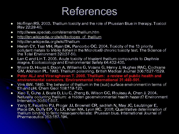 References l l l Hoffman RS. 2003. Thallium toxicity and the role of Prussian Blue in therapy. Toxicol Rev 22: 29 -40. http: //www. speclab. com/elements/thallium. htm http: //en. wikipedia. org/wiki/Isotopes_of_thallium http: //en. wikipedia. org/wiki/Thallium Hwieh CY, Tsai MH, Ryan DK, Pancorbo OC. 2004. Toxicity of the 13 priority pollutant metals to Vibrio fisheri in the Microtox® chronic toxicity test. The Science of the Total Environment 320: 37 -50. Lan C and Lin T. 2005. Acute toxicity of trivalent thallium compounds to Daphnia magna. Ecotoxicology and Environmental Safety 64: 432 -435. Moore D, House I, Dixon A, Williams G, Volans G, Henry J, Hughes RAC, Cochrane GM, Atkinson PL. 1993. Thallium poisoning. British Medical Journal 306: 1527 -1529. Peter ALJ and Viraraghavan T. 2005. Thallium: a review of public health and environmental concenrs. Environmental International 31: 493 -501. Vink BW. 1993. The behavior of thallium in the (sub) surface environment in terms of Eh and p. H. Chem Geol 109: 119 -123. Xiao T, Guha J, Boyle D, Liu C, Zheng B, Wilson GC, Rouleau A, Chen J. 2004. Naturally occurring thallium: a hidden geoenvironmental health hazard? Environment Internation 30: 501 -507. Yang Y, Faustino PJ, Progar JJ, Brownell CR, sadrieh N, May JC, Leutzinger E, Place DA, Duffy EP, Yu LX, Khan MA, Lyon RC. 2008. Quantitative determination of thallium binding to ferric hexacyanoferrate: Prussian blue. International Journal of Pharmaceutics 353: 187 -194.