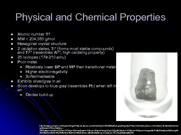 Physical and Chemical Properties l l l l Atomic number 81 MW = 204. 383 g/mol Hexagonal crystal structure 2 oxidation states, Tl+ (forms most stable compounds) and Tl 3+ (resembles Al 3+, high oxidizing property) 25 isotopes (179 -210 amu) Poor metal l Relatively lower BP and MP than transitional metals l Higher electronegativity l Softer/malleable Exhibits silver/gray in air Soon develops to blue-gray (resembles Pb) when left in air l Oxides build up http: //images. google. com/imgres? imgurl=http: //z. about. com/d/chemistry/1/0/k/Q/thallium. jpg&imgrefurl=http: //chemistry. about. com/od/periodictableelements/ ig/Element-Photo-Gallery. -98/Thallium. htm&h=222&w=197&sz=7&hl=en&start=10&um=1&tbnid=z. Kgn. NAy. LRq. Cgt. M: &tbnh=107&tbnw=95&prev=/images%3 Fq%3 Dthallium%26 ndsp% 3 D 20%26 um%3 D 1%26 hl%3 Den%26 client%3 Dfirefox-a%26 rls%3 Dorg. mozilla: en-US: official%26 sa%3 DN