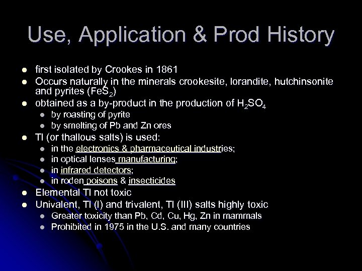 Use, Application & Prod History l l l first isolated by Crookes in 1861 Occurs naturally in the minerals crookesite, lorandite, hutchinsonite and pyrites (Fe. S 2) obtained as a by-product in the production of H 2 SO 4 l l l Tl (or thallous salts) is used: l l l by roasting of pyrite by smelting of Pb and Zn ores in the electronics & pharmaceutical industries; in optical lenses manufacturing; in infrared detectors; in roden poisons & insecticides Elemental Tl not toxic Univalent, Tl (l) and trivalent, Tl (III) salts highly toxic l l Greater toxicity than Pb, Cd, Cu, Hg, Zn in mammals Prohibited in 1975 in the U. S. and many countries
