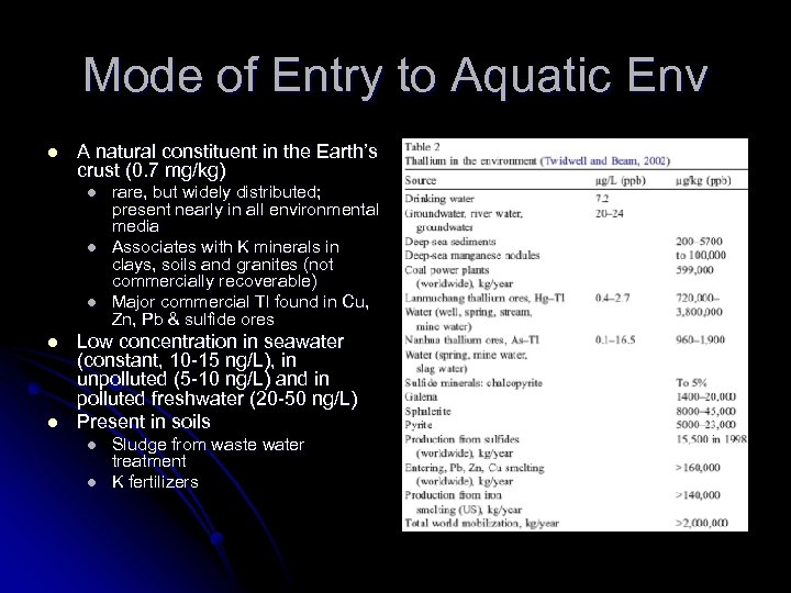 Mode of Entry to Aquatic Env l A natural constituent in the Earth’s crust (0. 7 mg/kg) l l l rare, but widely distributed; present nearly in all environmental media Associates with K minerals in clays, soils and granites (not commercially recoverable) Major commercial Tl found in Cu, Zn, Pb & sulfide ores Low concentration in seawater (constant, 10 -15 ng/L), in unpolluted (5 -10 ng/L) and in polluted freshwater (20 -50 ng/L) Present in soils l l Sludge from waste water treatment K fertilizers