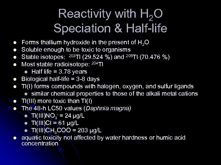 Reactivity with H 2 O Speciation & Half-life l l l l l Forms thallium hydroxide in the present of H 2 O Soluble enough to be toxic to organisms Stable isotopes: 203 Tl (29. 524 %) and 205 Tl (70. 476 %) Most stable radioisotope: 204 Tl l Half life = 3. 78 years Biological half-life = 3 -8 days Tl(I) forms compounds with halogen, oxygen, and sulfur ligands l similar chemical properties to those of the alkali metal cations Tl(III) more toxic than Tl(I) The 48 -h LC 50 values (Daphnia magna) l Tl(III)NO 3 - = 24 μg/L l Tl(III)Cl = 61 μg/L l Tl(III)CH 3 COO = 203 μg/L aquatic toxicity not affected by water hardness or humic acid concentration