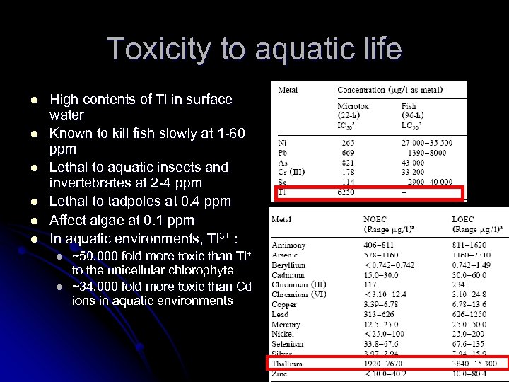 Toxicity to aquatic life l l l High contents of Tl in surface water Known to kill fish slowly at 1 -60 ppm Lethal to aquatic insects and invertebrates at 2 -4 ppm Lethal to tadpoles at 0. 4 ppm Affect algae at 0. 1 ppm In aquatic environments, Tl 3+ : l l ~50, 000 fold more toxic than Tl+ to the unicellular chlorophyte ~34, 000 fold more toxic than Cd ions in aquatic environments