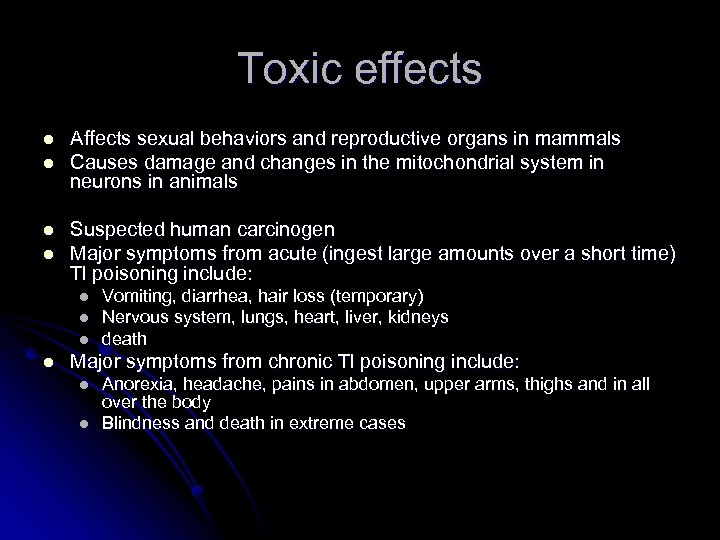 Toxic effects l l Affects sexual behaviors and reproductive organs in mammals Causes damage and changes in the mitochondrial system in neurons in animals Suspected human carcinogen Major symptoms from acute (ingest large amounts over a short time) Tl poisoning include: l l Vomiting, diarrhea, hair loss (temporary) Nervous system, lungs, heart, liver, kidneys death Major symptoms from chronic Tl poisoning include: l l Anorexia, headache, pains in abdomen, upper arms, thighs and in all over the body Blindness and death in extreme cases
