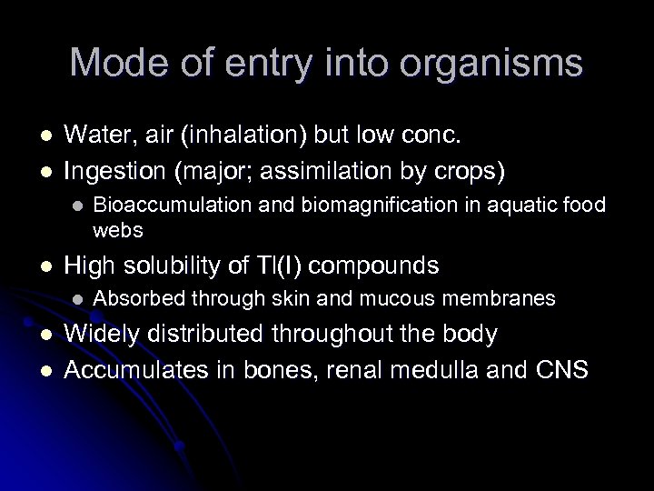 Mode of entry into organisms l l Water, air (inhalation) but low conc. Ingestion (major; assimilation by crops) l l High solubility of Tl(I) compounds l l l Bioaccumulation and biomagnification in aquatic food webs Absorbed through skin and mucous membranes Widely distributed throughout the body Accumulates in bones, renal medulla and CNS