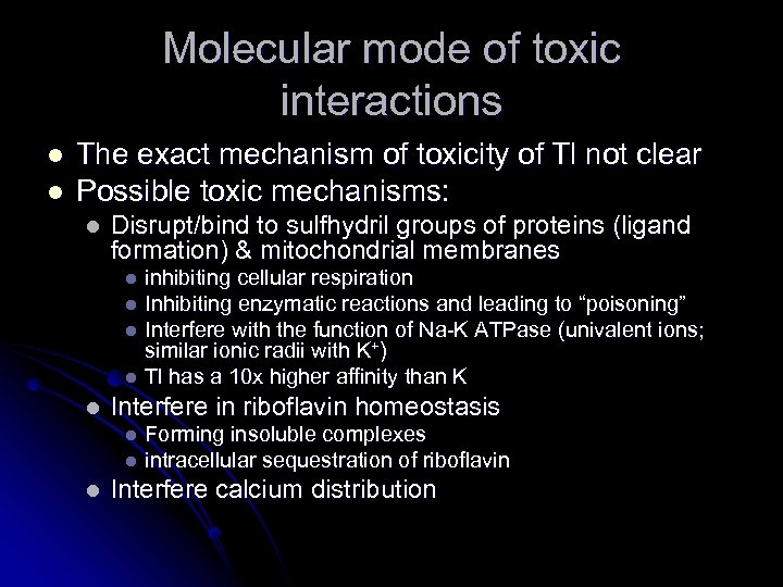Molecular mode of toxic interactions l l The exact mechanism of toxicity of Tl not clear Possible toxic mechanisms: l Disrupt/bind to sulfhydril groups of proteins (ligand formation) & mitochondrial membranes inhibiting cellular respiration l Inhibiting enzymatic reactions and leading to “poisoning” l Interfere with the function of Na-K ATPase (univalent ions; similar ionic radii with K+) l Tl has a 10 x higher affinity than K l l Interfere in riboflavin homeostasis Forming insoluble complexes l intracellular sequestration of riboflavin l l Interfere calcium distribution