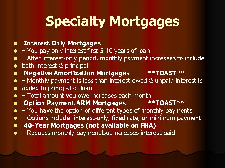 Specialty Mortgages l l l l Interest Only Mortgages – You pay only interest first 5 -10 years of loan – After interest-only period, monthly payment increases to include both interest & principal Negative Amortization Mortgages **TOAST** – Monthly payment is less than interest owed & unpaid interest is added to principal of loan – Total amount you owe increases each month Option Payment ARM Mortgages **TOAST** – You have the option of different types of monthly payments – Options include: interest-only, fixed rate, or minimum payment 40 -Year Mortgages (not available on FHA) – Reduces monthly payment but increases interest paid