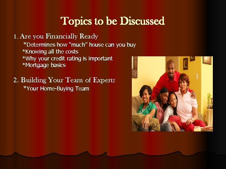 Topics to be Discussed 1. Are you Financially Ready *Determines how “much” house can you buy *Knowing all the costs *Why your credit rating is important *Mortgage basics 2. Building Your Team of Experts *Your Home-Buying Team