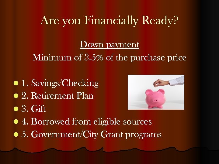 Are you Financially Ready? Down payment Minimum of 3. 5% of the purchase price l 1. Savings/Checking l 2. Retirement Plan l 3. Gift l 4. Borrowed from eligible sources l 5. Government/City Grant programs