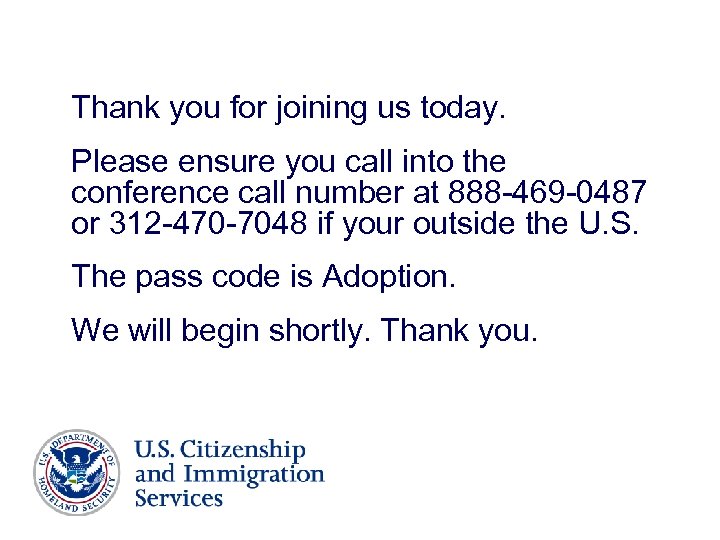 Thank you for joining us today. Please ensure you call into the conference call number at 888 -469 -0487 or 312 -470 -7048 if your outside the U. S. The pass code is Adoption. We will begin shortly. Thank you.