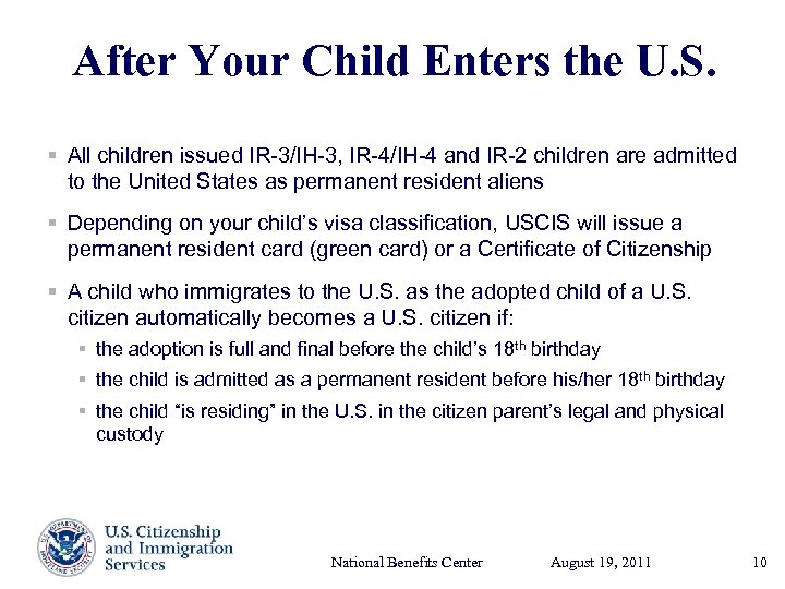 After Your Child Enters the U. S. § All children issued IR-3/IH-3, IR-4/IH-4 and IR-2 children are admitted to the United States as permanent resident aliens § Depending on your child’s visa classification, USCIS will issue a permanent resident card (green card) or a Certificate of Citizenship § A child who immigrates to the U. S. as the adopted child of a U. S. citizen automatically becomes a U. S. citizen if: § the adoption is full and final before the child’s 18 th birthday § the child is admitted as a permanent resident before his/her 18 th birthday § the child “is residing” in the U. S. in the citizen parent’s legal and physical custody National Benefits Center August 19, Presenter’s Name 2011 17, 2003 June 10