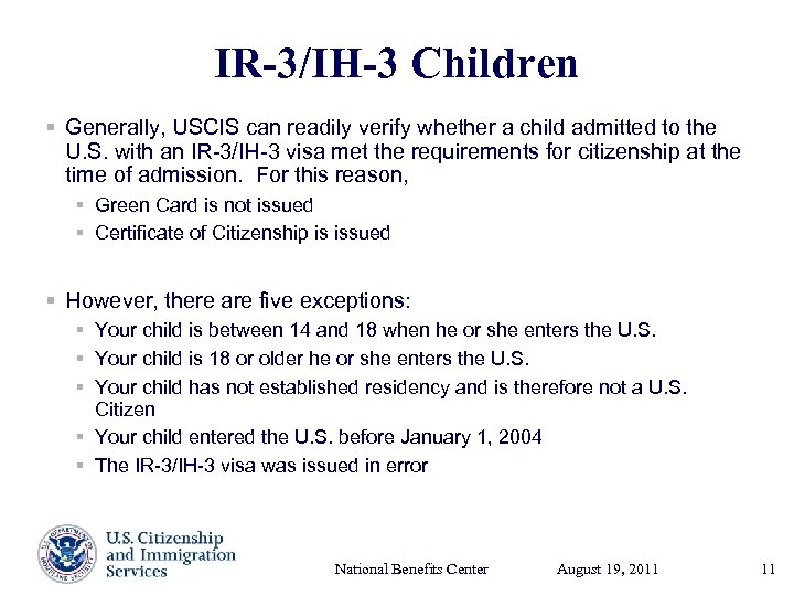 IR-3/IH-3 Children § Generally, USCIS can readily verify whether a child admitted to the U. S. with an IR-3/IH-3 visa met the requirements for citizenship at the time of admission. For this reason, § Green Card is not issued § Certificate of Citizenship is issued § However, there are five exceptions: § Your child is between 14 and 18 when he or she enters the U. S. § Your child is 18 or older he or she enters the U. S. § Your child has not established residency and is therefore not a U. S. Citizen § Your child entered the U. S. before January 1, 2004 § The IR-3/IH-3 visa was issued in error National Benefits Center August 19, Presenter’s Name 2011 17, 2003 June 11