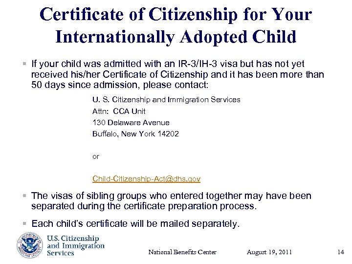 Certificate of Citizenship for Your Internationally Adopted Child § If your child was admitted with an IR-3/IH-3 visa but has not yet received his/her Certificate of Citizenship and it has been more than 50 days since admission, please contact: U. S. Citizenship and Immigration Services Attn: CCA Unit 130 Delaware Avenue Buffalo, New York 14202 or Child-Citizenship-Act@dhs. gov § The visas of sibling groups who entered together may have been separated during the certificate preparation process. § Each child’s certificate will be mailed separately. National Benefits Center August 19, Presenter’s Name 2011 17, 2003 June 14