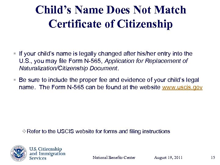 Child’s Name Does Not Match Certificate of Citizenship § If your child’s name is legally changed after his/her entry into the U. S. , you may file Form N-565, Application for Replacement of Naturalization/Citizenship Document. § Be sure to include the proper fee and evidence of your child’s legal name. The Form N-565 can be found at the website www. uscis. gov v Refer to the USCIS website forms and filing instructions National Benefits Center August 19, Presenter’s Name 2011 17, 2003 June 15