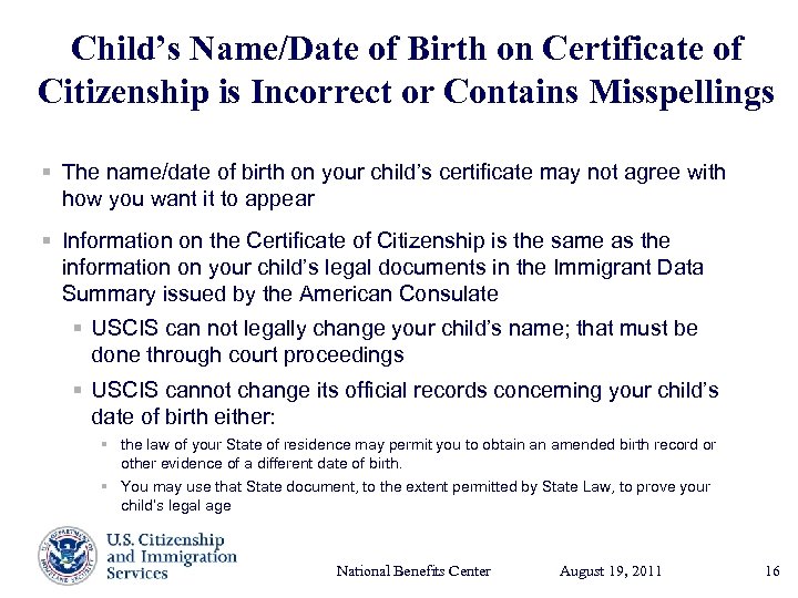 Child’s Name/Date of Birth on Certificate of Citizenship is Incorrect or Contains Misspellings § The name/date of birth on your child’s certificate may not agree with how you want it to appear § Information on the Certificate of Citizenship is the same as the information on your child’s legal documents in the Immigrant Data Summary issued by the American Consulate § USCIS can not legally change your child’s name; that must be done through court proceedings § USCIS cannot change its official records concerning your child’s date of birth either: § the law of your State of residence may permit you to obtain an amended birth record or other evidence of a different date of birth. § You may use that State document, to the extent permitted by State Law, to prove your child’s legal age National Benefits Center August 19, Presenter’s Name 2011 17, 2003 June 16
