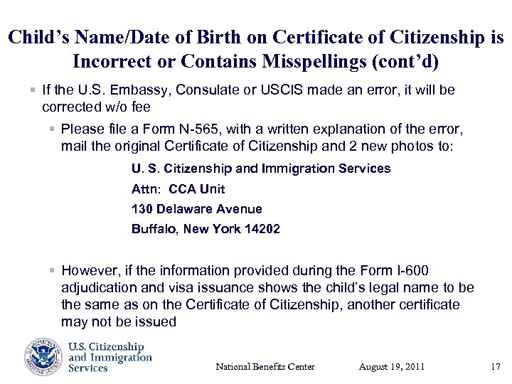 Child’s Name/Date of Birth on Certificate of Citizenship is Incorrect or Contains Misspellings (cont’d) § If the U. S. Embassy, Consulate or USCIS made an error, it will be corrected w/o fee § Please file a Form N-565, with a written explanation of the error, mail the original Certificate of Citizenship and 2 new photos to: U. S. Citizenship and Immigration Services Attn: CCA Unit 130 Delaware Avenue Buffalo, New York 14202 § However, if the information provided during the Form I-600 adjudication and visa issuance shows the child’s legal name to be the same as on the Certificate of Citizenship, another certificate may not be issued National Benefits Center August 19, Presenter’s Name 2011 17, 2003 June 17