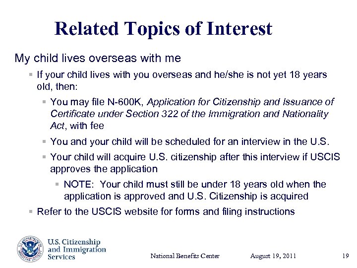 Related Topics of Interest My child lives overseas with me § If your child lives with you overseas and he/she is not yet 18 years old, then: § You may file N-600 K, Application for Citizenship and Issuance of Certificate under Section 322 of the Immigration and Nationality Act, with fee § You and your child will be scheduled for an interview in the U. S. § Your child will acquire U. S. citizenship after this interview if USCIS approves the application § NOTE: Your child must still be under 18 years old when the application is approved and U. S. Citizenship is acquired § Refer to the USCIS website forms and filing instructions National Benefits Center August 19, Presenter’s Name 2011 17, 2003 June 19