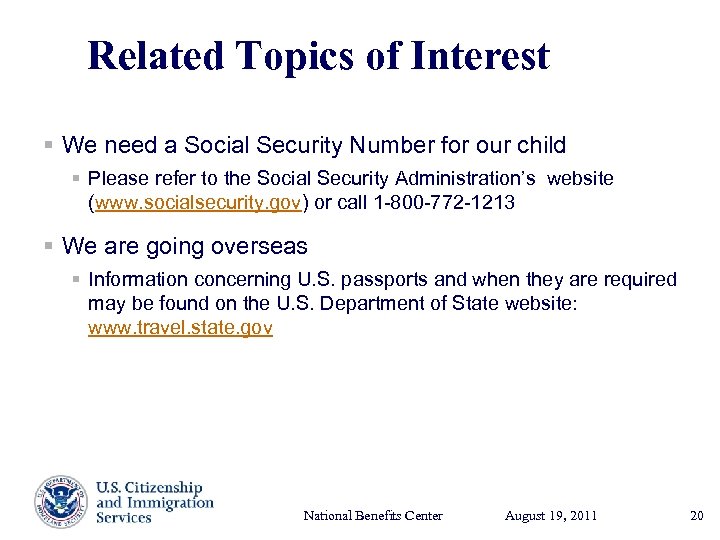 Related Topics of Interest § We need a Social Security Number for our child § Please refer to the Social Security Administration’s website (www. socialsecurity. gov) or call 1 -800 -772 -1213 § We are going overseas § Information concerning U. S. passports and when they are required may be found on the U. S. Department of State website: www. travel. state. gov National Benefits Center August 19, Presenter’s Name 2011 17, 2003 June 20