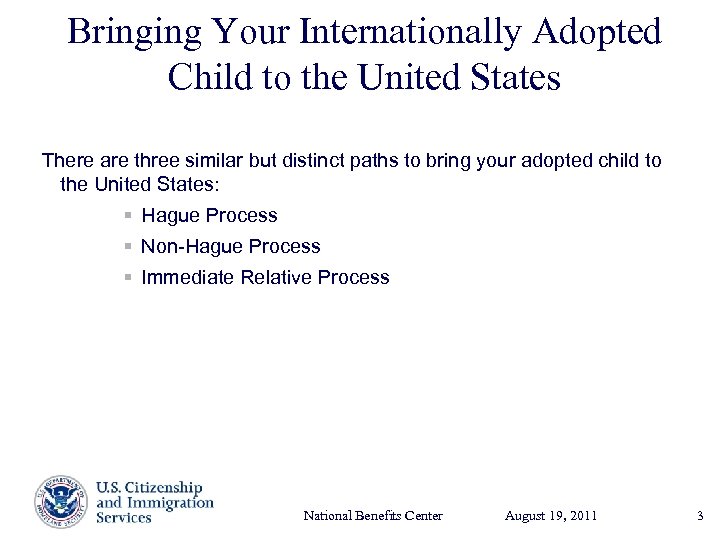 Bringing Your Internationally Adopted Child to the United States There are three similar but distinct paths to bring your adopted child to the United States: § Hague Process § Non-Hague Process § Immediate Relative Process National Benefits Center August 19, Presenter’s Name 2011 17, 2003 June 3