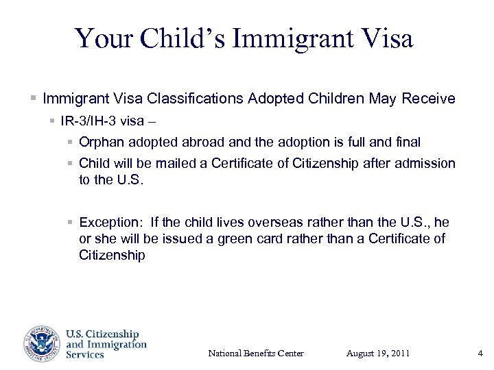 Your Child’s Immigrant Visa § Immigrant Visa Classifications Adopted Children May Receive § IR-3/IH-3 visa – § Orphan adopted abroad and the adoption is full and final § Child will be mailed a Certificate of Citizenship after admission to the U. S. § Exception: If the child lives overseas rather than the U. S. , he or she will be issued a green card rather than a Certificate of Citizenship National Benefits Center August 19, Presenter’s Name 2011 17, 2003 June 4