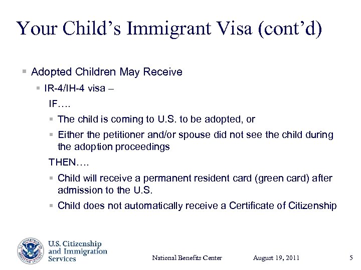 Your Child’s Immigrant Visa (cont’d) § Adopted Children May Receive § IR-4/IH-4 visa – IF…. § The child is coming to U. S. to be adopted, or § Either the petitioner and/or spouse did not see the child during the adoption proceedings THEN…. § Child will receive a permanent resident card (green card) after admission to the U. S. § Child does not automatically receive a Certificate of Citizenship National Benefits Center August 19, Presenter’s Name 2011 17, 2003 June 5