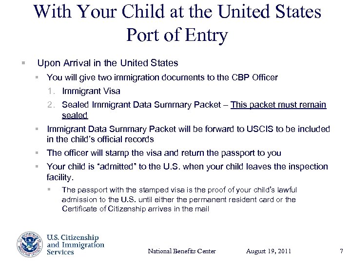With Your Child at the United States Port of Entry § Upon Arrival in the United States § You will give two immigration documents to the CBP Officer 1. Immigrant Visa 2. Sealed Immigrant Data Summary Packet – This packet must remain sealed § Immigrant Data Summary Packet will be forward to USCIS to be included in the child’s official records § The officer will stamp the visa and return the passport to you § Your child is “admitted” to the U. S. when your child leaves the inspection facility. § The passport with the stamped visa is the proof of your child’s lawful admission to the U. S. until either the permanent resident card or the Certificate of Citizenship arrives in the mail National Benefits Center August 19, Presenter’s Name 2011 17, 2003 June 7
