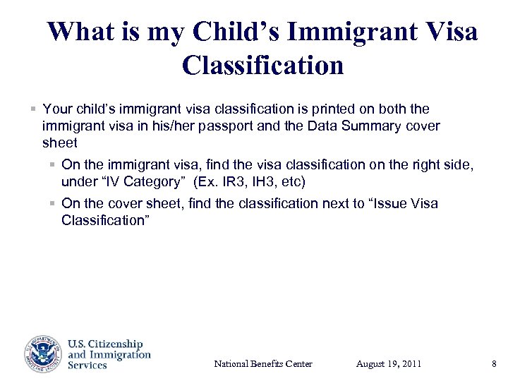 What is my Child’s Immigrant Visa Classification § Your child’s immigrant visa classification is printed on both the immigrant visa in his/her passport and the Data Summary cover sheet § On the immigrant visa, find the visa classification on the right side, under “IV Category” (Ex. IR 3, IH 3, etc) § On the cover sheet, find the classification next to “Issue Visa Classification” National Benefits Center August 19, Presenter’s Name 2011 17, 2003 June 8