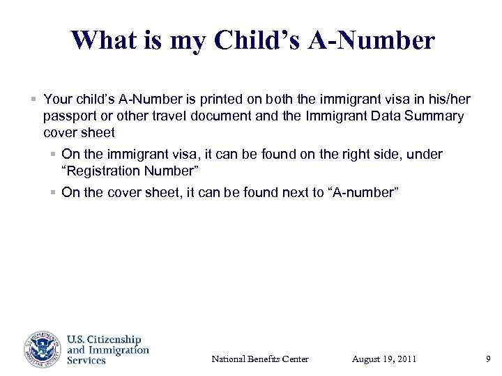 What is my Child’s A-Number § Your child’s A-Number is printed on both the immigrant visa in his/her passport or other travel document and the Immigrant Data Summary cover sheet § On the immigrant visa, it can be found on the right side, under “Registration Number” § On the cover sheet, it can be found next to “A-number” National Benefits Center August 19, Presenter’s Name 2011 17, 2003 June 9