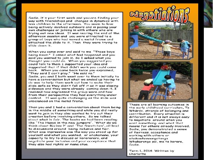 Learning Stories as a tool to make children’s agency visible § Dweck (2000): strengthening children’s dispositions by making the learning visible, children can see themselves as a social agent § Kei Tua o te Pae (2009): foregrounding a particular lens in narrative assessment, shows what is valued learning § Gunn & de Vocht (2011): revisiting the LS again helps build confidence and competence towards social agency, increased dialogue § Carr (2011): teachers learning dialogic skills