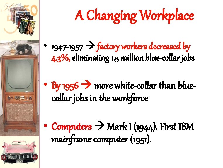 A Changing Workplace • 1947 -1957 factory workers decreased by 4. 3%, eliminating 1. 5 million blue-collar jobs • By 1956 more white-collar than bluecollar jobs in the workforce • Computers Mark I (1944). First IBM mainframe computer (1951).