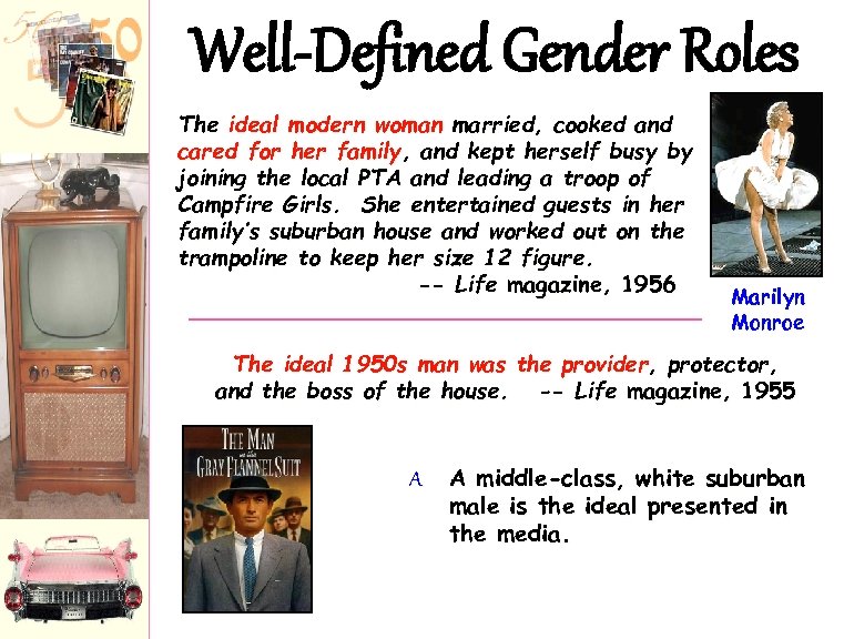 Well-Defined Gender Roles The ideal modern woman married, cooked and cared for her family, and kept herself busy by joining the local PTA and leading a troop of Campfire Girls. She entertained guests in her family’s suburban house and worked out on the trampoline to keep her size 12 figure. -- Life magazine, 1956 Marilyn Monroe The ideal 1950 s man was the provider, protector, and the boss of the house. -- Life magazine, 1955 A A middle-class, white suburban male is the ideal presented in the media.