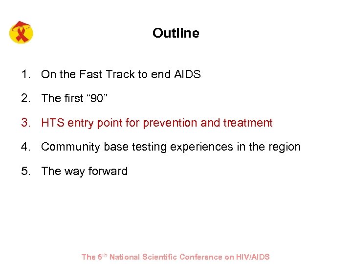 Outline 1. On the Fast Track to end AIDS 2. The first “ 90” 3. HTS entry point for prevention and treatment 4. Community base testing experiences in the region 5. The way forward The 6 th National Scientific Conference on HIV/AIDS